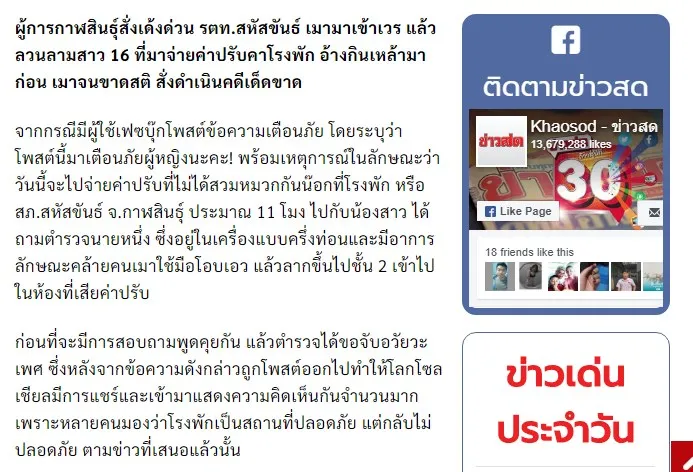 ล่าสุดข่าวรายงานว่า ...ผู้การกาฬสินธุ์สั่งเด้งด่วน รตท.สหัสขันธ์ เมามาเข้าเวร แล้วลวนลามสาว 16 ที่มาจ่ายค่าปรับคาโรงพัก อ้างกินเหล้ามาก่อน เมาจนขาดสติ สั่งดำเนินคดีเด็ดขาด