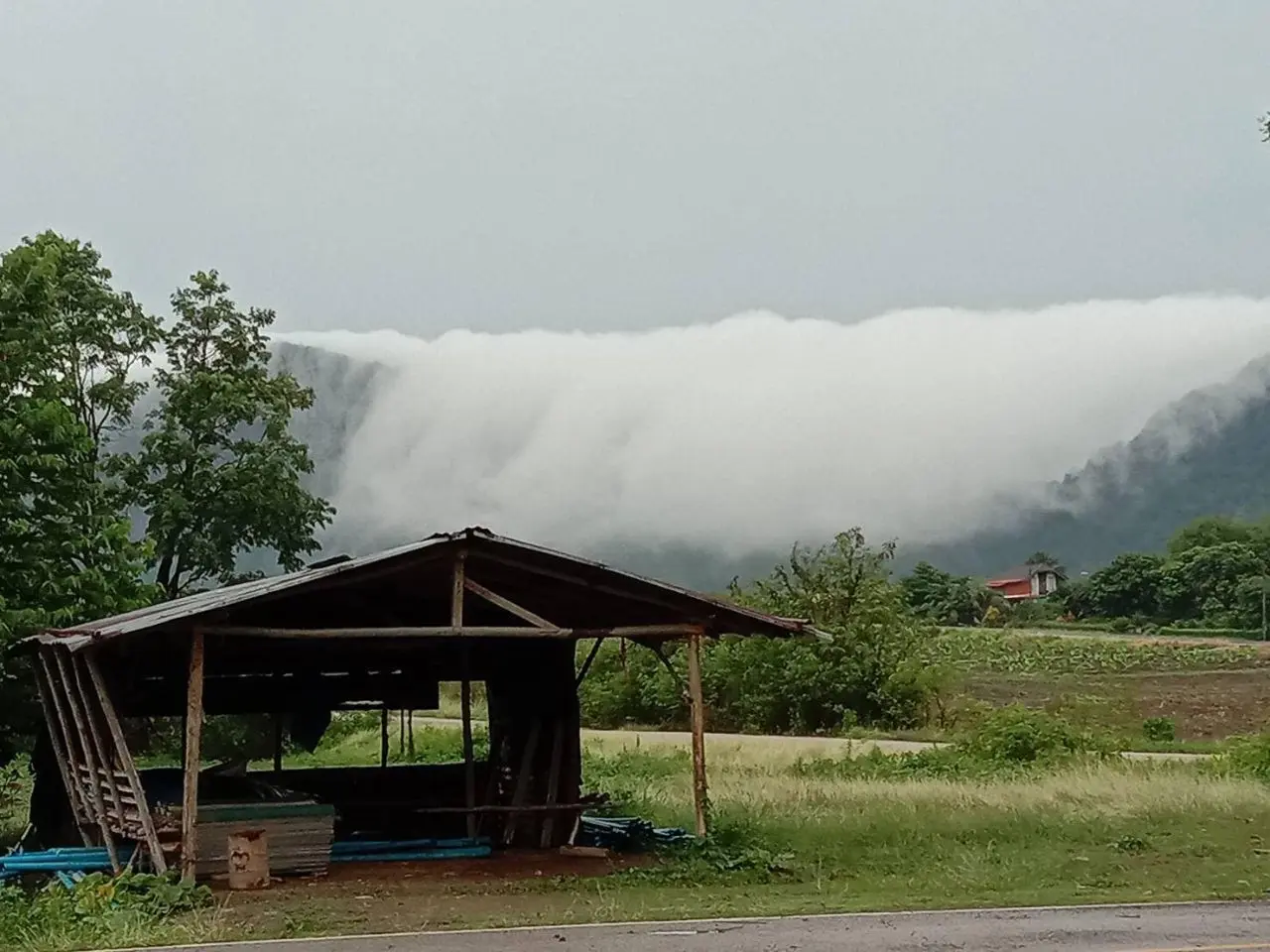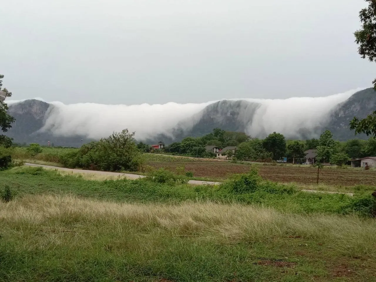 หลังจากอากาศร้อนอบอ้าวมานาน เมื่อวานเกิดพายุฤดูร้อน ทำให้ฝนตกในหลายพื้นที่ของจังหวัดสระแก้ว เกิดเป็นหมอกลอยขึ้นเมื่อมาเจอกับภูเขาทำให้หมอกยกตัวขึ้นแล้วตกลงหลังเขา คล้ายน้ำตก เป็นปรากฏการณ์ธรรมชาติที่นานๆ จะพบหมอกรวมตัวกันแน่น แล้วตกมาอย่างสวยงาม