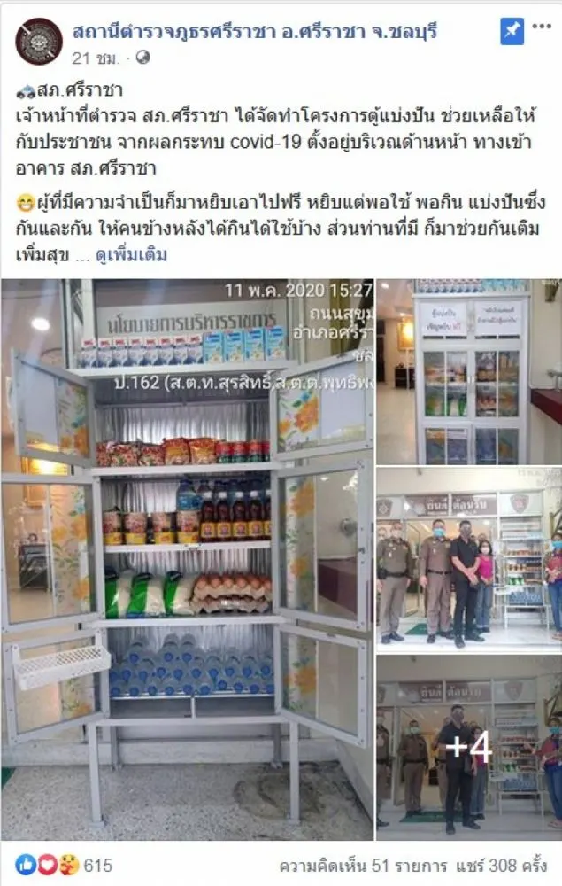 สภ.ศรีราชา เจ้าหน้าที่ตำรวจ สภ.ศรีราชา ได้จัดทำโครงการตู้แบ่งปัน ช่วยเหลือให้กับประชาชน จากผลกระทบ covid 19 ตั้งอยู่บริเวณด้านหน้า ทางเข้าอาคาร สภ.ศรีราชา