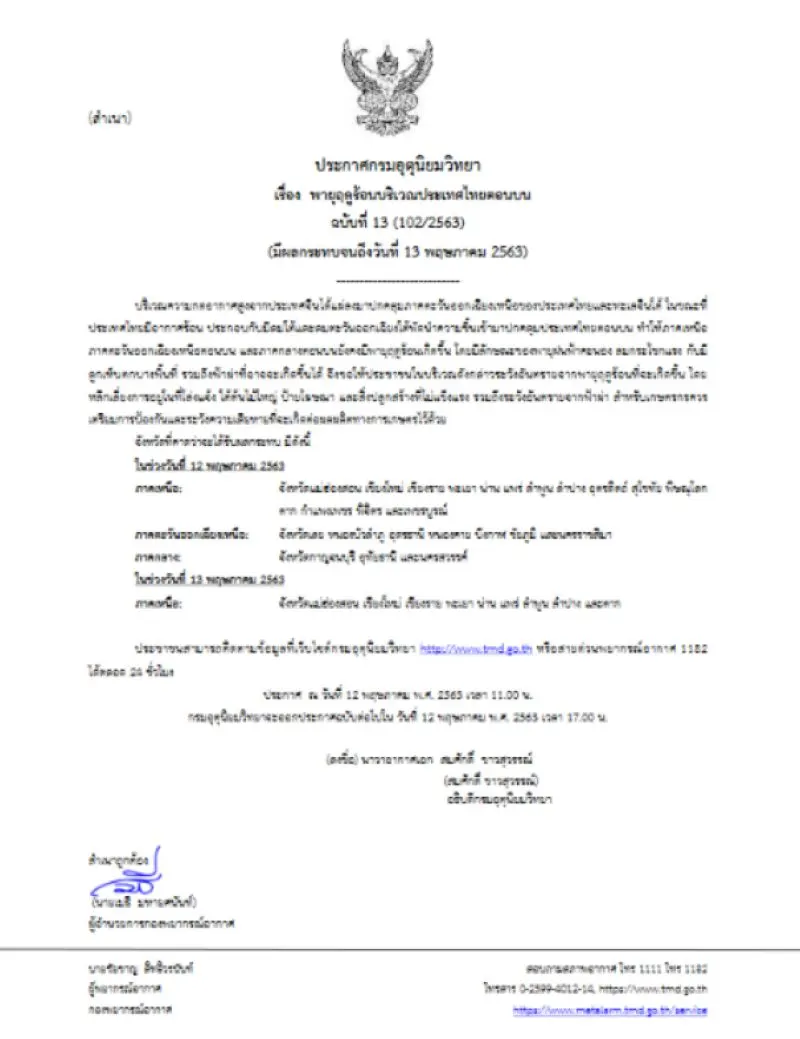 อย่างไรก็ตาม ประชาชนสามารถติดตามข้อมูลที่เว็บไซต์ กรมอุตุนิยมวิทยา หรือสายด่วนพยากรณ์อากาศ 1182 ได้ตลอด 24 ชั่วโมง