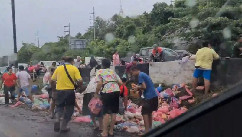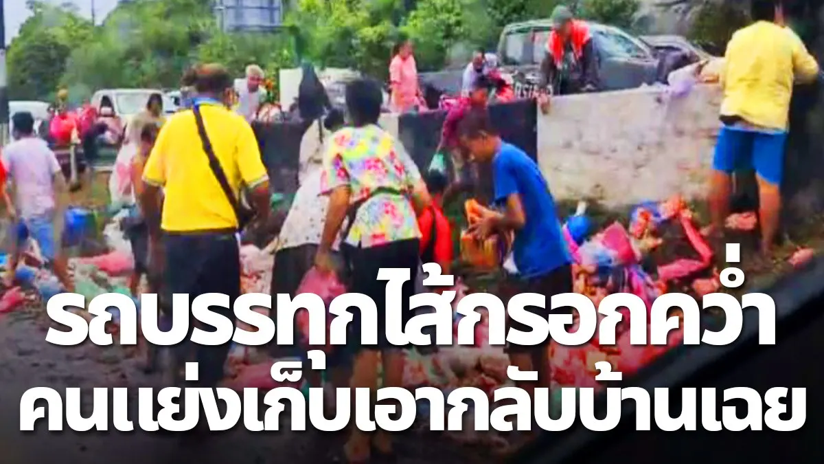 หนุ่มสุดงง เห็นชาวบ้านจอดรถขวางถนน วิ่งเก็บไส้กรอกหอบกลับบ้าน หลังรถบรรทุกไส้กรอกคว่ำ