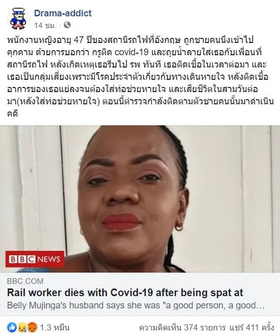 พนักงานหญิงอายุ 47 ปีของสถานีรถไฟที่อังกฤษ ถูกชายคนนึงเข้าไปคุกคาม ด้วยการบอกว่า กรูติด covid-19 และถุยน้ำลายใส่เธอกับเพื่อนที่สถานีรถไฟ หลังเกิดเหตุเธอรีบไป รพ ทันที เธอติดเชื้อในเวลาต่อมา และเธอเป็นกลุ่มเสี่ยงเพราะมีโรคประจำตัวเกี่ยวกับทางเดินหายใจ หลังติดเชื้อ อาการของเธอแย่ลงจนต้องใส่ท่อช่วยหายใจ และเสียชีวิตในสามวันต่อมา(หลังใส่ท่อช่วยหายใจ) ตอนนี้ตำรวจกำลังติดตามตัวชายคนนั้นมาดำเนินคดี
