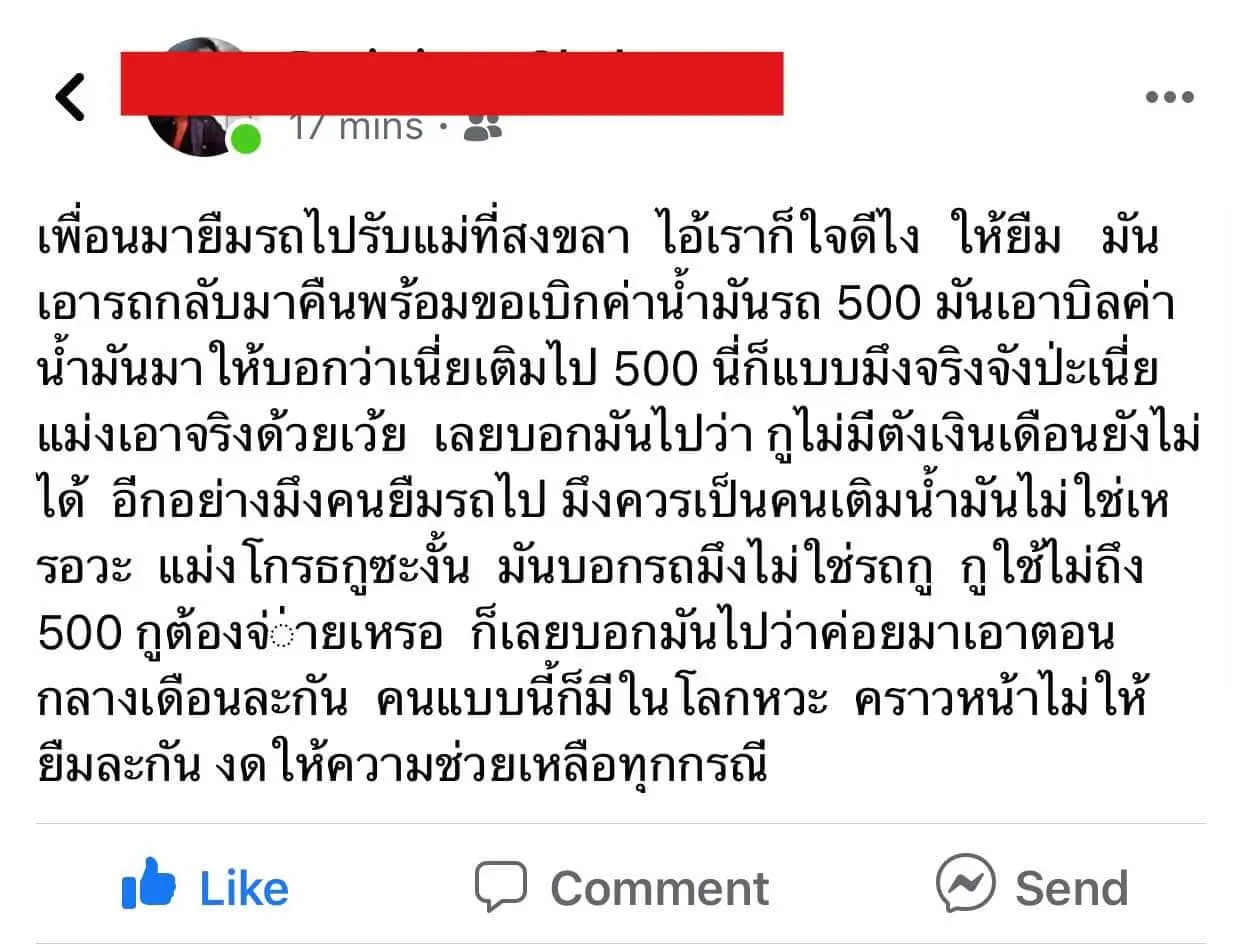 เรียกได้ว่าเป็นอีกหนึ่งเรื่องราวที่มีชาวเน็ตพูดถึงและแชร์กันในวงกว้าง เมื่อผู้ใช้เฟซบุ๊กรายหนึ่งเป็นเพื่อนกับ...เพจดังทักไปแชร์เรื่องเพื่อนยืมรถไปรับแม่ที่ต่างจังหวัด ก็เลยให้เพื่อนยืมสุดท้ายเพื่อนนำรถมาคืนพร้อมกับใบเสร็จเติมน้ำมันขอเบิกคืน ชี้ใช้ไม่ถึง 500 ทำชาวเน็ตวิจารณ์ยับ