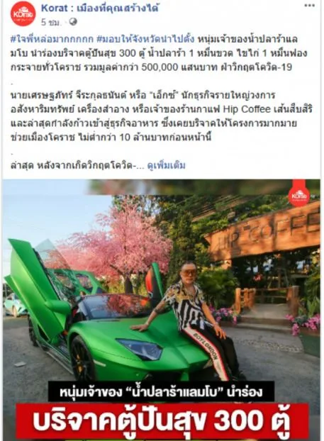 มีรายงานว่า เมื่อวันที่ 13 พค 63 ทางเพจเฟสบุ๊ก Korat เมืองที่คุณสร้างได้ ได้โพสต์ภาพของเศรษฐีหนุ่มรายหนึ่ง ที่บริจาคช่วยเหลือในช่วงวิกฤตโควิดนี้ โดยระบุข้อความว่า ใจพี่หล่อมากกกกก มอบให้จังหวัดนำไปตั้ง หนุ่มเจ้าของน้ำปลาร้าแลมโบ นำร่องบริจาคตู้ปันสุข 300 ตู้ น้ำปลาร้า 1 หมื่นขวด ไขไก่ 1 หมื่นฟอง กระจายทั่วโคราช รวมมูลค่ากว่า 5 แสนบาท ฝ่าเหตุการณ์ Co Vid 19