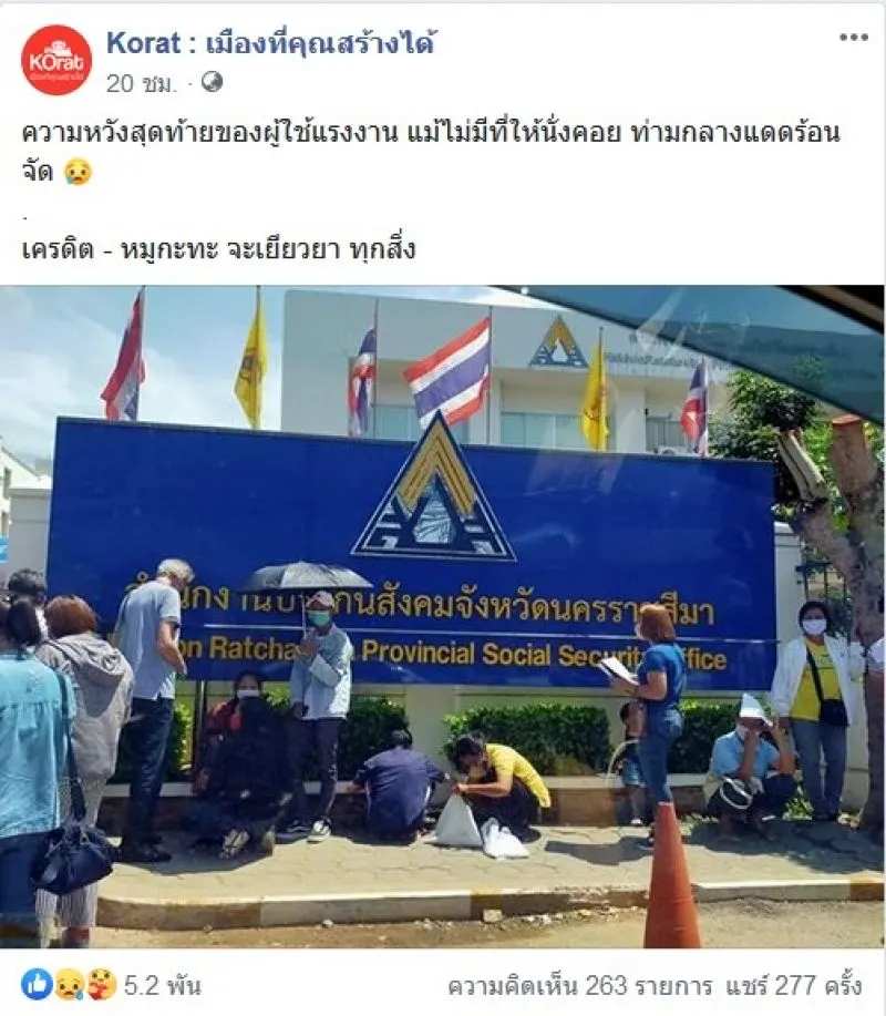 ล่าสุด ได้มีประชาชนหลายคน ที่ลงทะเบียนไปตั้งนานแล้ว แต่ยังไม่ได้รับเงิน ได้รวมตัวเรียกร้องที่หน้าสำนักงานประกันสังคมจังหวัด นครราชสีมา ซึ่งทุกคนต่างก็มาด้วยความหวัง เพราะเงินที่จะได้รับการช่วยเหลือจากประกันสังคมคือเงินก้อนสุดท้าย เพราะพวกเขาเหล่านี้ไม่สามารถลงทะเบียนเยียวยาจากรัฐบาลได้เหมือนบุคคลอื่น