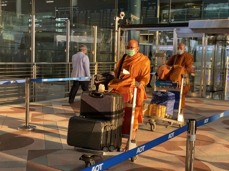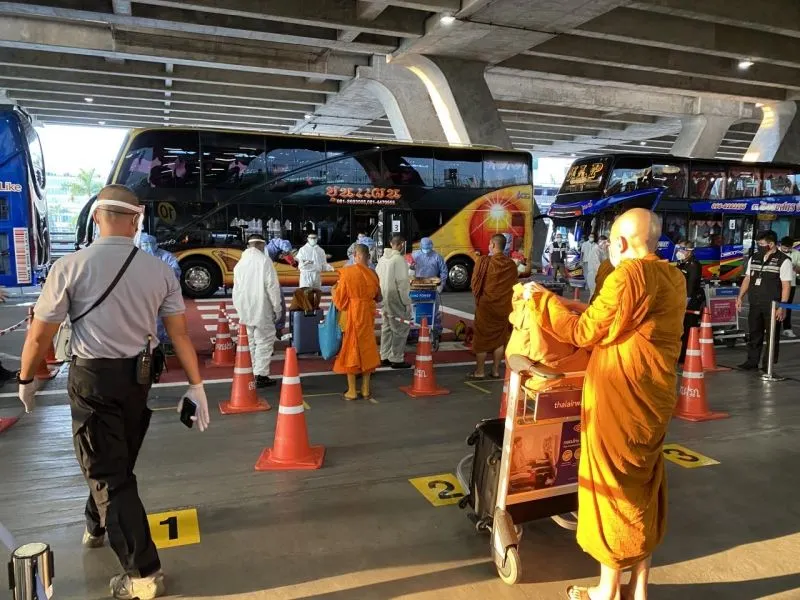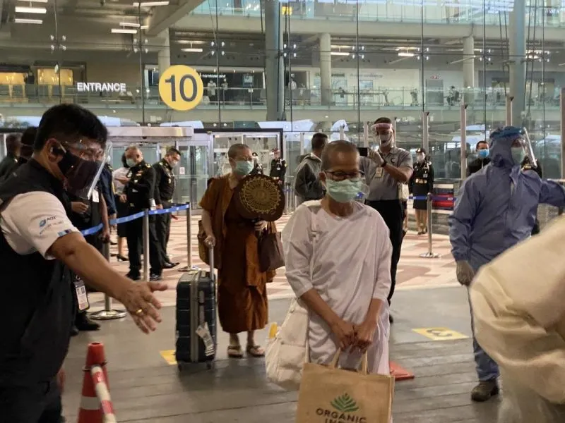 โดยสายการบินไทยสมายล์ เที่ยวบินที่ 8092 เครื่องลงเวลา 17.15 น. ทั้งหมดผ่านการตรวจคัดกรองแล้ว พบผู้มีอุณหภูมิสูง 3 คน มีอาการประจำตัว 2 คน เจ้าหน้าที่ดำเนินการนำส่งขึ้นรถบัส จำนวน 124 คน ไปที่โรงแรม H2do สมุทรปราการ เพื่อดำเนินการกักตัว 14 วัน ตามมาตรการรัฐ ในจำนวนนี้ เป็นพระภิกษุสามเณร 76 รูป ภิกษุณี 2 รูป แม่ชี 11 คน ที่เหลือ เป็นฆราวาส 40 คน