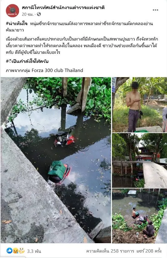 ทั้งนี้ โพสต์ดังกล่าวระบุข้อความว่า "น่าเห็นใจ หนุ่มขี่รถจักรยานยนต์ส่งอาหารพลาดท่าขี่รถจักรยานต์ยนต์ตกคลองย่านคันนายาว" ช่วงนี้ใครที่กำลังขับรถบริการส่งอาหารก็ต้องระมัดระวังเป็นพิเศษเป็นกำลังใจให้สู้ๆครับ