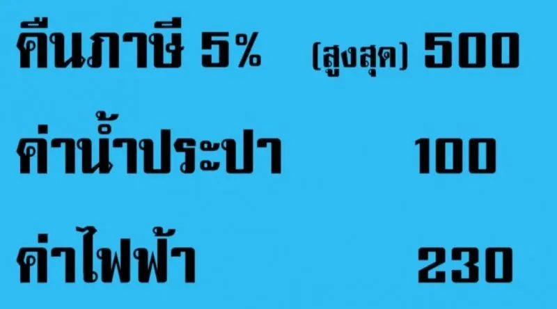 4.วงเงินคืนภาษี 5 % สำหรับการนำบัตรคนจนไปรูดซื้อสิ้นค้ากับร้านที่เข้าร่วมโครงการคืนภาษีสูงสุด 500 บาท / 5.เงินช่วยเหลือค่าน้ำประปา 100 บาท / 6.เงินช่วยเหลือค่าไฟฟ้า 230 บาท