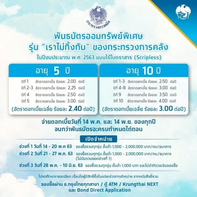 กระทรวงการคลังเปิดขายพันธบัตรรัฐบาลออมทรัพย์พิเศษ รุ่น “เราไม่ทิ้งกัน” วงเงิน 50,000 ล้านบาท วันนี้14 พฤษภาคม 2563 เวลา 8.30 น. เป็นวันแรกแต่คนที่จะซื้อได้ต้องเป็นผู้ที่มีอายุ 60 ปีขึ้นไปตามเงื่อนไขที่กระทรวงการคลังกำหนดว่า การเปิดขายช่วงแรกตั้งแต่วันที่ 14-20พฤษภาคม 2563 เปิดขายให้กับผู้ที่มีอายุ 60 ปีขึ้นไปหรือผู้ที่เกิดก่อนหรือเกิดภายในปี 2503 วงเงินการซื้อขั้นต่ำ 1,000 บาท สูงสุด 2ล้านบาท เท่านั้นจากนั้นในวันที่ 21 – 27 พฤษภาคม 2563 จะเปิดประชาชนทั่วไปรวมอายุ 60ปีขึ้นไปซื้อ วงเงินขั้นต่ำ 1,000 บาท สูงสุด 2 ล้านบาทถ้ายังขายไม่หมด ในวันที่ 28- 10 พฤษภาคม 2563จะเปิดให้ประชาชนทั่วไปรวมอายุ 60 ปีขึ้นไป ซื้อวงเงิน 1,000 บาทแบบไม่จำกัดวงเงิน