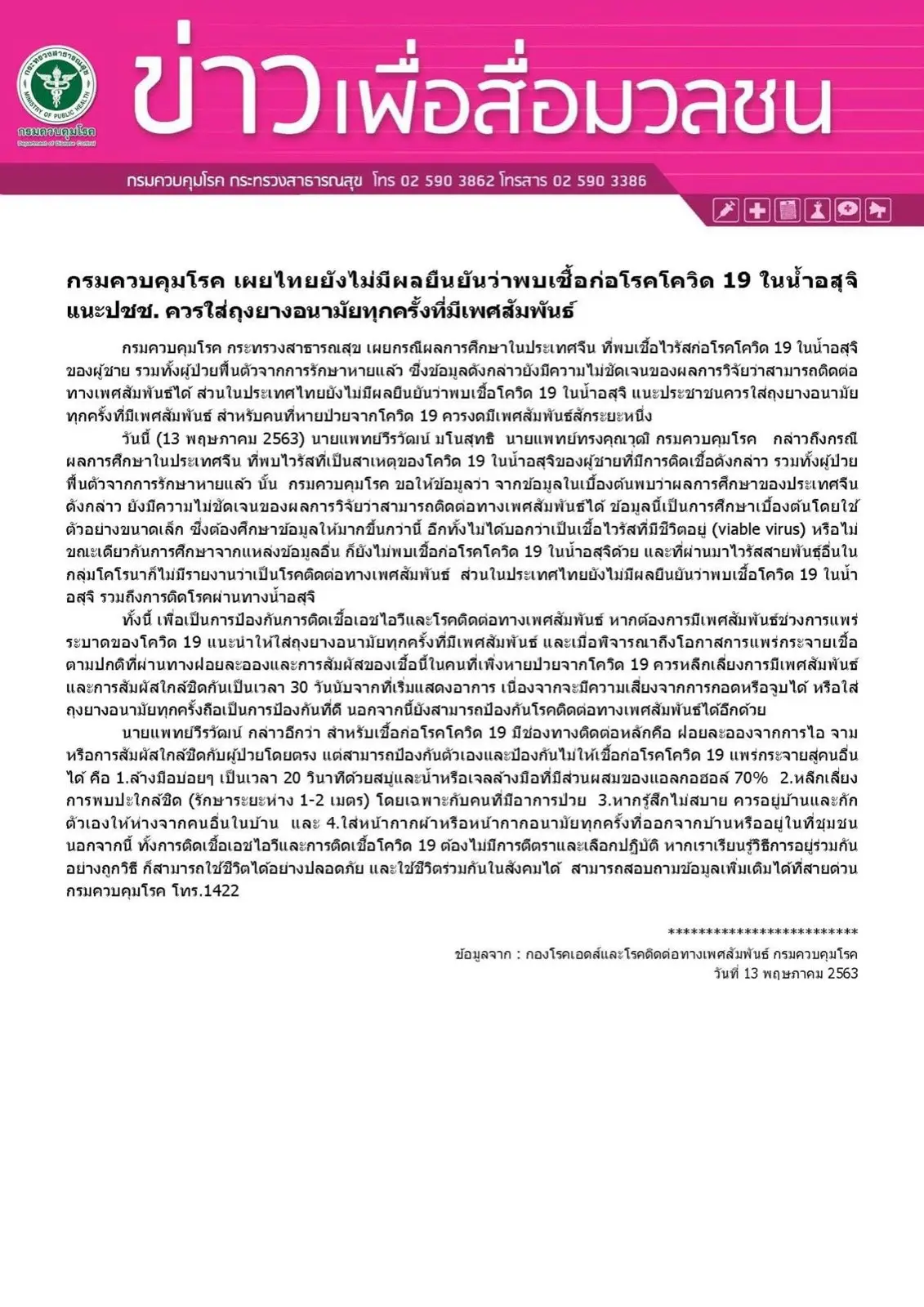 กรมควบคุมโรค เผยไทยยังไม่มีผลยืนยันว่าพบเชื้อก่อโรคโควิด 19 ในน้ำอสุจิ แนะปชช. ควรใส่ถุงยางฯ