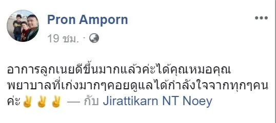 "อาการลูกเนยดีขึ้นมากแล้วค่ะได้คุณหมอคุณพยาบาลที่เก่งมาก ๆ คอยดูแล ได้กำลังใจจากทุก ๆ คนค่ะ"