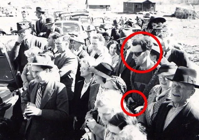ภาพถ่ายที่โด่งดังภาพนี้ถูกถ่ายขึ้นที่งานเปิดตัวสะพาน Gold Bridge ในประเทศแคนาดาในปี 1941 โดยแสดงให้เห็นผู้คนจำนวนมากที่กำลังยืนมุงอยู่ แต่ก็มีคนตาดีที่สังเกตุว่า มีชายในภาพถ่ายคนหนึ่งที่ดูแตกต่างจากผู้คนในภาพ เพราะตัวเขาเองแต่งตัวแตกต่างจากแฟชั่นในยุค 1940 อย่างมาก ไม่ว่าจะเป็นเสื้อยืดคอกลม ที่ถูกสวมทับด้วยเสื้อฮูดที่มีซิป แว่นดำรูปทรงแปลกๆ และกล้องถ่ายรูปที่ดูแตกต่างจากคนอื่นๆ จนกระทั่งบางคนเชื่อว่า เขาคือชายที่มาจากโลกอนาคต