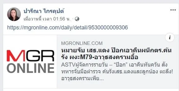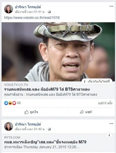 นอกจากนี้น.ส.ปารีณา ยังแชร์ข่าวเกี่ยวกับเสธ.แดง และลูกน้องคนสนิทมาลงไว้ในเฟซบุ๊ก หลายข่าวด้วยกัน เช่น