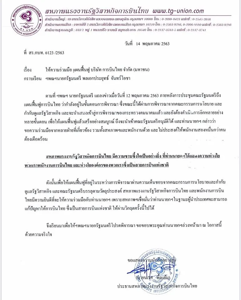 ดังนั้นเพื่อให้แผนฟื้นฟูที่อยู่ในระหว่างการพิจารณาผ่านความเห็นชอบจากคณะกรรมการนโยบายและกำกับดูแลรัฐวิสาหกิจ และคณะรัฐมนตรีบรรลุตามวัตถุประสงค์ สหภาพแรงงานรัฐวิสาหกิจการบินไทย และพนักงานการบินไทยมีความยินดีที่จะให้ความร่วมมือกับท่านนายกฯ เพราะสหภาพฯเชื่อมั่นว่าท่านนายกฯในฐานะผู้นำประเทศจะสามารถแก้ปัญหาให้การบินไทย ซึ่งเป็นสายการบินแห่งชาติ ให้ผ่านวิกฤตครั้งนี้ไปได้