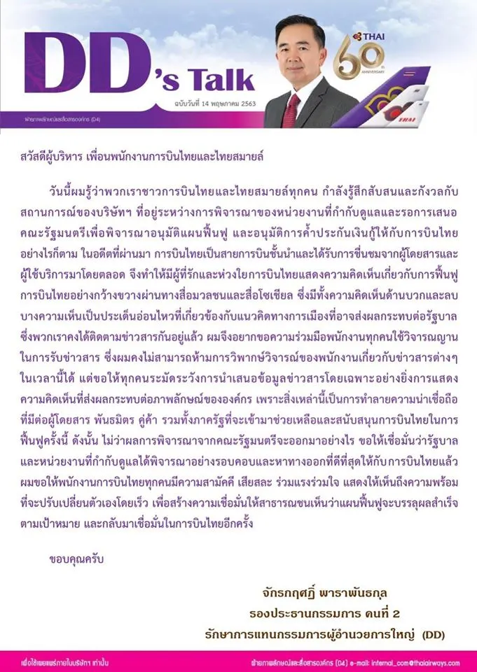ระบุว่า สวัสดีผู้บริหาร เพื่อนพนักงานการบินไทยและไทยสมายล์ วันนี้ผมรู้ว่าพวกเราชาวการบินไทยและไทยสมายล์ทุกคน กำลังรู้สึกสับสนและกังวลกับ สถานการณ์ของบริษัทฯ ที่อยู่ระหว่างการพิจารณาของหน่วยงานที่กำกับดูแลและรอการเสนอ คณะรัฐมนตรีเพื่อพิจารณาอนุมัติแผนฟื้นฟู และอนุมัติการค้ำประกันเงินกู้ให้กับการบินไทย....