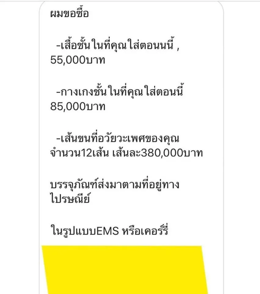 น.ส.ฐรินดา หรือ มิ้งค์ กล่าวต่อว่า ตนจึงตอบไปว่าไม่รับงานแบบนี้ จากนั้นชายคนดังกล่าวจึงยื่นข้อเสนอมาว่าให้ส่งชุดชั้นในมาก็ได้ พร้อมกับติดต่อขอซื้อขนเพชรในราคา 5 หมื่นบาท โดยชายโรคจิตดังกล่าว ก็พยายามจะวิดีโอคอลมาตลอดเวลา แต่ตนไม่รับ พอตนไม่รับก็จะส่งภาพอนาจารของตัวเองมาให้ ซึ่งตนก็ได้บล็อคไป โดยชายโรคจิตยังส่งข้อความมาบอกอีกว่าถ้าบล็อคเขา เขาก็จะตามไปทุกช่องทาง เขามีบัญชีไอจีและเฟซบุ๊กรวมกว่า 50 บัญชี จะตามระรานไปตลอด