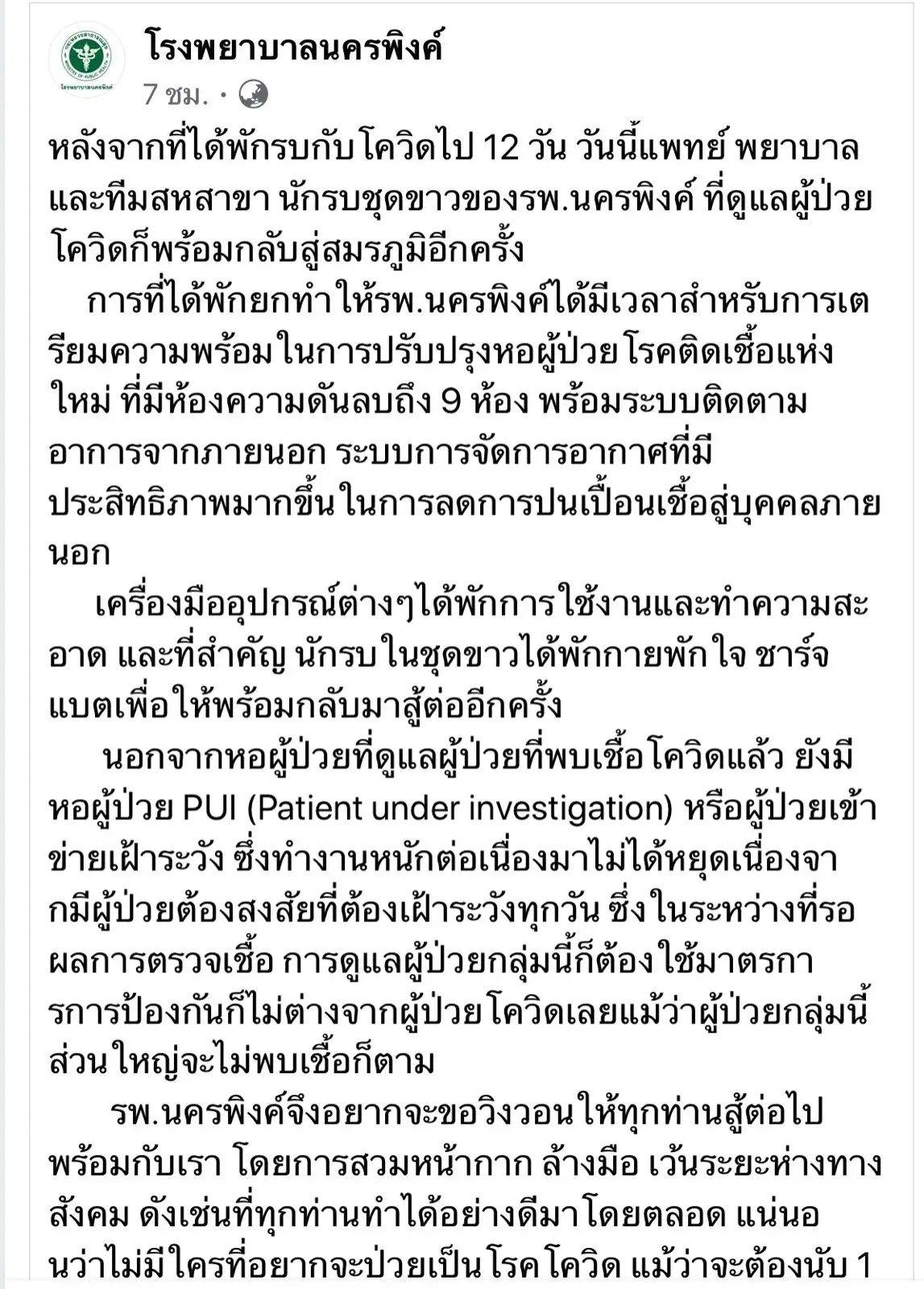 เพจโรงพยาบาลนครพิงค์ โพสต์เรื่องราว หลังจากที่ได้พักรบกับโควิดไป 12 วัน วันนี้แพทย์ พยาบาลและทีมสหสาขา นักรบชุดขาวของรพ.นครพิงค์ ที่ดูแลผู้ป่วยโควิดก็พร้อมกลับสู่สมรภูมิอีกครั้ง