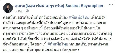 ล่าสุด คุณหญิงสุดารัตน์ เกยุราพันธุ์ ประธานคณะกรรมการยุทธศาสตร์ พรรคเพื่อไทย ได้โพสต์ข้อความลงในแฟนเพจเฟซบุ๊คซึ่งเป็นเหตุการณ์ขณะลงพื้นที่ช่วยเหลือชาวบ้าน ซึ่งข้อความทั้งหมดถูกระบุเอาไว้ดังนี้..