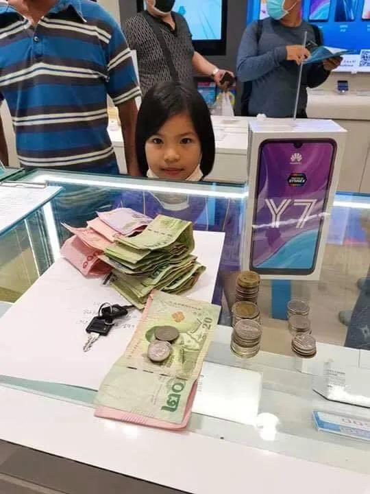 เช่นเดียวกับหนูน้อยคนนี้ ที่ต้องการเรียนออนไลน์กับเพื่อนๆแต่ที่บ้านไม่มีโทรศัพท์สมาทโฟน หนูน้อยจึงแคะกระปุกออมสิน ได้เงินจำนวนหนึ่ง คุณยายก็ได้พาหลานมาซื้อ บอกเจ้าของร้านว่า“จ่ายเป็นเหรียญด้วยได้มั้ย” คนขายถึงกับมือสั่นทำอะไรไม่ถูกเลยทีเดียว