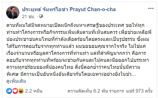 16 พ.ค. 63 - พล.อ.ประยุทธ์ จันทร์โอชา นายกรัฐมนตรี ได้โพสต์ข้อความในเฟซบุ๊กระบุว่า "ตามที่ผมได้มีจดหมายเปิดผนึกถึงมหาเศรษฐีของประเทศ ขอให้ทุกท่านทำโครงการหรือกิจกรรมเพิ่มเติมตามที่เห็นสมควร เพื่อช่วยเหลือพี่น้องประชาชนคนไทยที่กำลังเดือดร้อนโดยตรงและเป็นรูปธรรม ซึ่งผมได้รับการตอบรับจากทุกท่านแล้ว