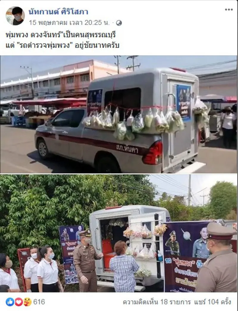 ล่าสุด ทางด้านผู้ใช้เฟสบุ๊ค นัทกานต์ ศิริโสภา ก็ได้ออกมาโพสต์ภาพไอเดียสุดเจ๋งของตำรวจ สภ.หันคา จ.ชัยนาท เปลี่ยนรถสายตรวจเป็นพุ่มพวงแจกผักชาวบ้าน โดยระบุว่า