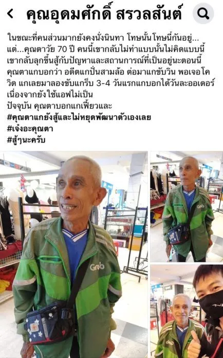 เช่นเดียวกับคุณตาวัย 70 ปีท่านนี้ กลายเป็นที่ฮือฮาอย่างมากในโซเชียล โดยตาได้ยืมโทรศัพท์หลานมาลองใช้แอฟแล้วไปขับรถแกร็บฟุ้ด ส่งอาหารในเมืองบุรีรัมย์เพราะก่อนหน้านี้ตามีอาชีพรับจ้างขับรถสามล้อปั่นมานานกว่า 30 ปี เมื่อเริ่มหมดแรง ก็หันมาขับรถ มอเตอร์ไซค์รับจ้าง แต่ก็เจอปัญหาคือการแย่งลูกค้า จึงสู้คนรุ่นใหม่ไม่ได้บวกกับช่วงนี้เจอสถานการณ์โควิด ลูกค้าเงียบเลยลองมาขับแกร็ปส่งอาหาร