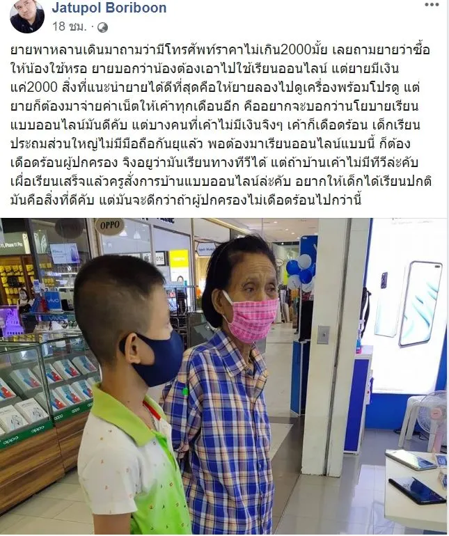 เช่นเดียวกับกรณีล่าสุด หลังจากที่ผู้ใช้เฟซบุ๊ก “Jatupol Boriboon” ได้โพสต์ภาพของยายกับหลานที่ไปขอซื้อโทรศัพท์ที่ร้านแห่งหนึ่ง พร้อมระบุว่า