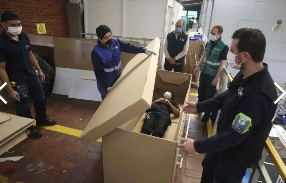 จากข่าวเป็นเตียงกนระดาษลัง ที่ไว้รองนอนสำหรับคนป่วยโควิด19 และเป็นโลงศพได้ในตัว สามารถรับน้ำหนักได้ 330 ปอนด์ (150 กิโลกรัม) ง่ายต่อการประกอบ และจะมีราคาประมาณ 85 ดอลลาร์ เขาบอกว่าเขาทำงานร่วมกับคลินิกส่วนตัวในการออกแบบซึ่งเขาหวังว่าจะถูกนำไปใช้ในคลินิกฉุกเฉินที่อาจจะสั้นบนเตียง
