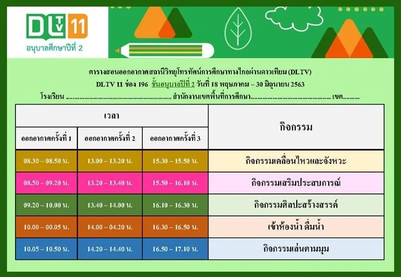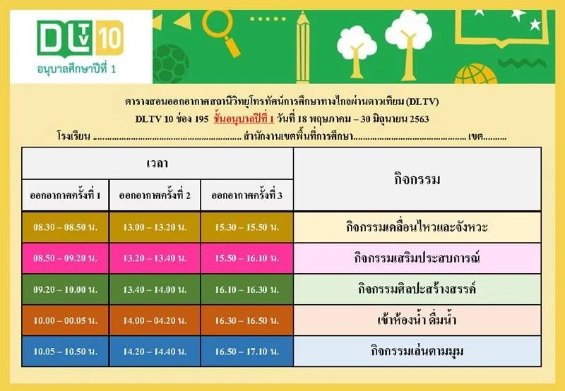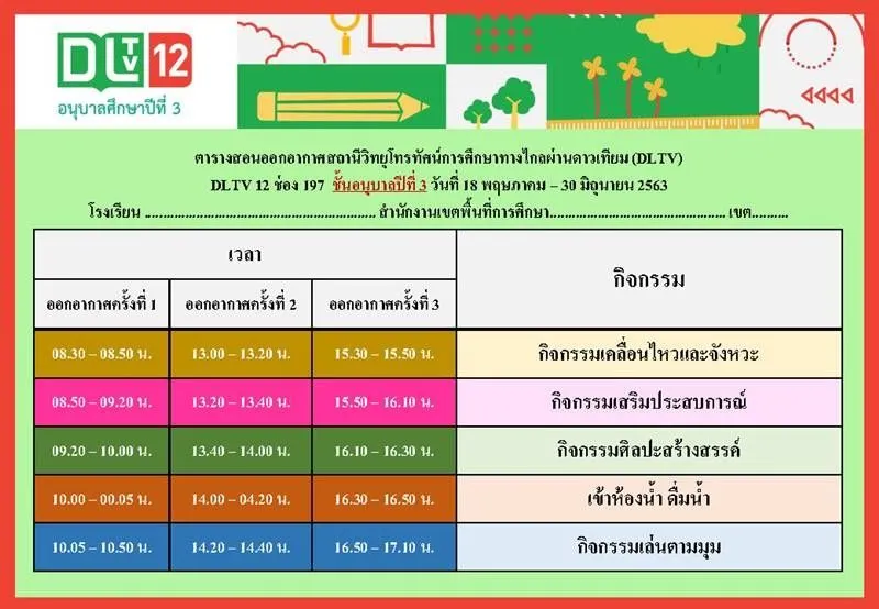 จากกรณีที่มีการจัดให้นักเรียนเรื่อนออนไลน์ เนื่องจากสถานการณ์การแพร่กระจายของ CO VID ที่เลื่อนการเปิดเทอมออกไปนั้น ล่าสุดวันที่ 18 พฤษภาคม 2563 เป็นวันแรกที่มีการเรียนออนไลน์ ทางเฟซบุ๊ก DLTV ดูย้อนหลัง ได้เผยแพร่ ตารางสอน ตารางเรียน DLTV ประจำวันที่ 18 พฤษภาคม ถึง 30 มิถุนายน 2563 ตั้งแต่ระดับชั้น อนุบาลที่ 1 ไปจนถึงชั้น มัธยมศึกษาปีที่ 3 โดยมีรายละเอียดดังต่อไปนี้