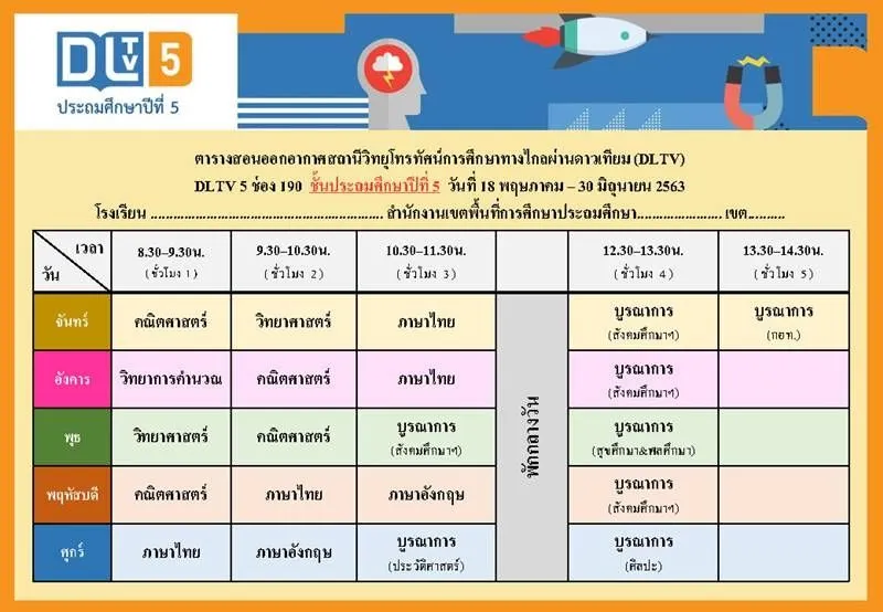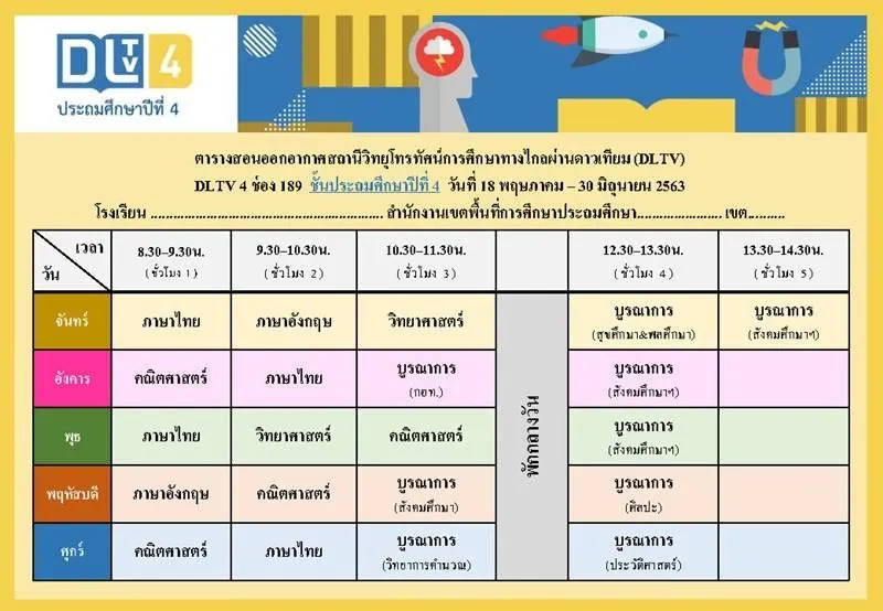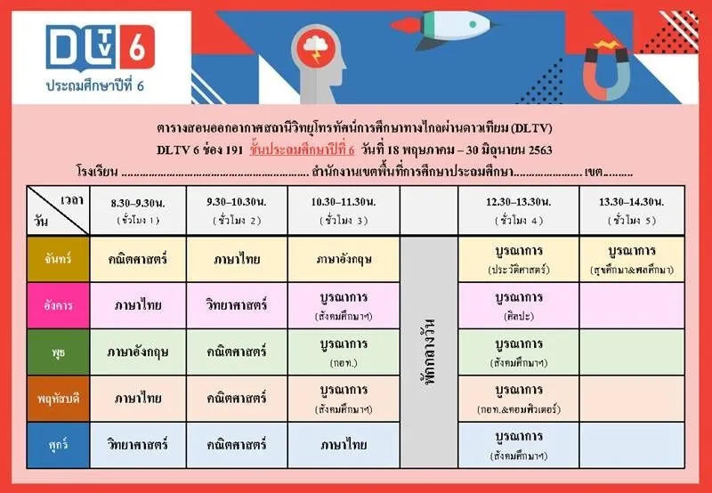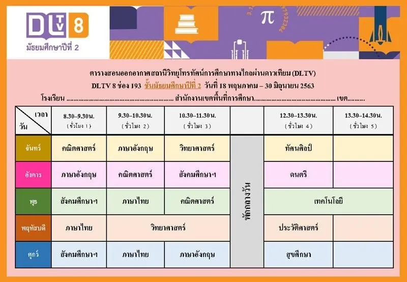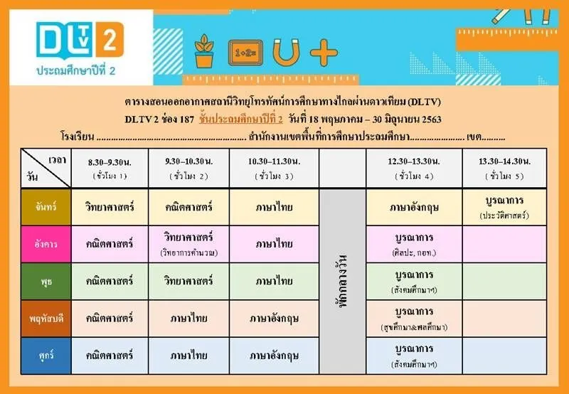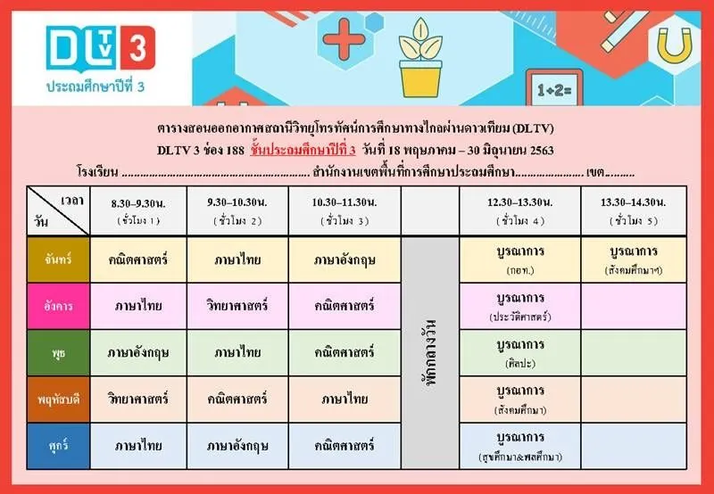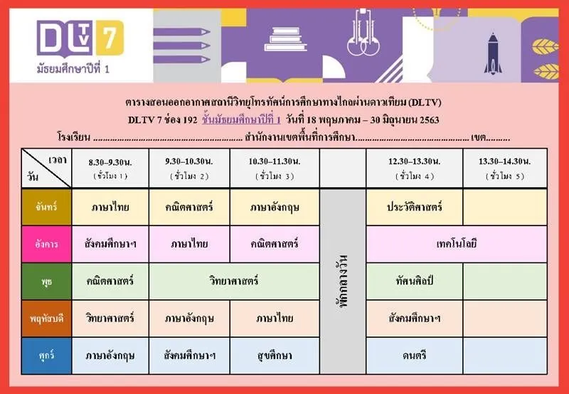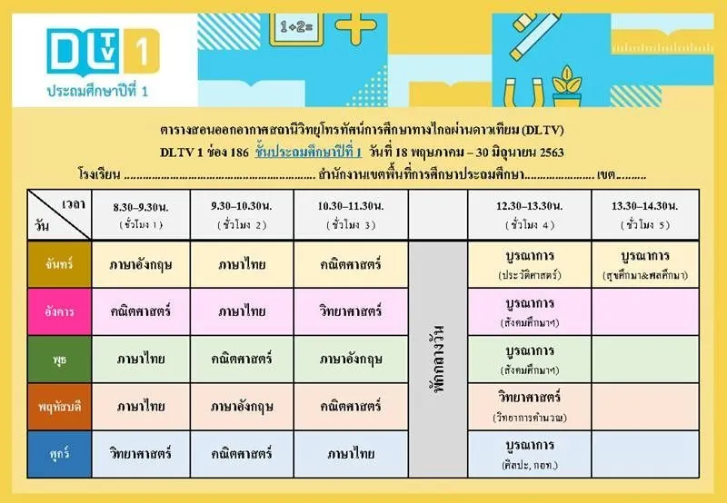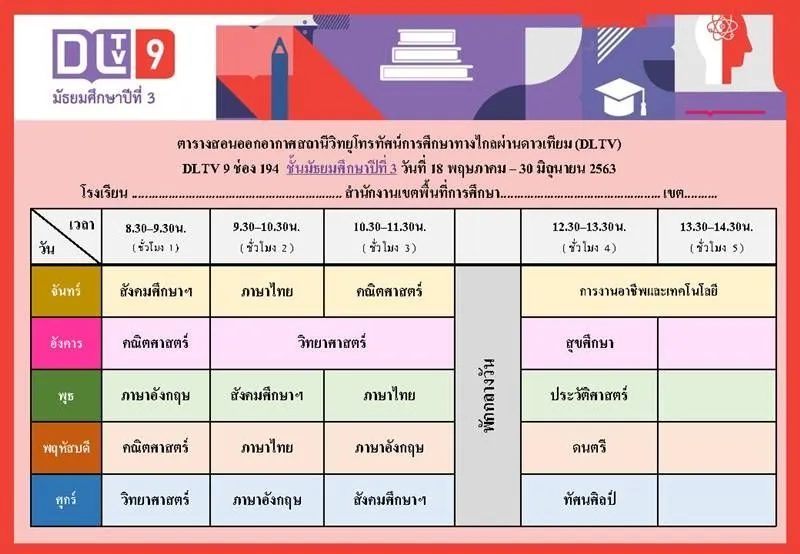 ทั้งนี้ ตารางเรียนดังกล่าวเป็นกำหนดการที่เกี่ยวข้องเฉพาะการเรียนการสอนของ DLTV เท่านั้น ซึ่งจะมีความแตกต่างกันกับตารางเรียนของโรงเรียนที่มีการจัดการศึกษาออนไลน์ของตัวเอง