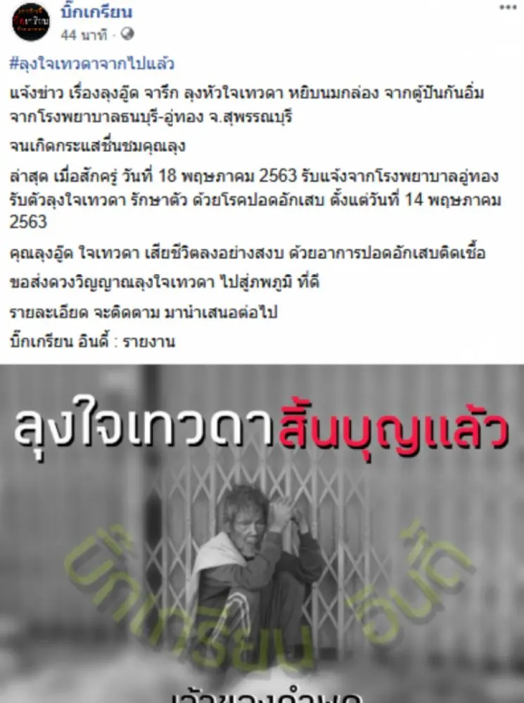 ล่าสุด เมื่อสักครู่ วันที่ 18 พฤษภาคม 2563 รับแจ้งจากโรงพยาบาลอู่ทอง รับตัวลุงใจเทวดา รักษาตัว ด้วยโรคปอดอักเสบ ตั้งแต่วันที่ 14 พฤษภาคม 2563 คุณลุงอู๊ด ใจเทวดา เสียชีวิตลงอย่างสงบ ด้วยอาการปอดอักเสบติดเชื้อ ขอส่งดวงวิญญาณลุงใจเทวดา ไปสู่ภพภูมิ ที่ดี รายละเอียด จะติดตาม มานำเสนอต่อไป