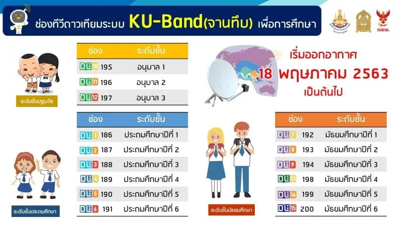 2.ทีวีดาวเทียม KU Band ช่อง 186 ถึง 200 ในช่องทางทีวีดาวเทียม KU Band มีทั้งหมด 15 ช่องเช่นกัน ได้แก่ ระดับชั้นอนุบาล 3 ช่อง ตั้งแต่ช่อง 195 ถึง 197 ระดับชั้นประถมศึกษาปีที่ 1 ถึง 6 ตั้งแต่ช่อง 186 ถึง 191 และระดับชั้นมัธยมศึกษาปีที่ 1 ถึง 6 ตั้งแต่ช่อง 192 ถึง 200