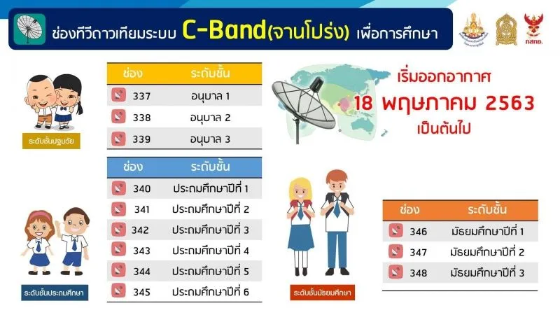 3.ทีวีดาวเทียม C Band ช่อง 337 ถึง 348 ในส่วนของทีวีดาวเทียม C Band หรือจานโปร่งนั้น มีทั้งหมด 12 ช่อง เริ่มตั้งแต่ชั้นอนุบาล 1 ถึง 3 ช่อง 337 ถึง 339 ตามด้วยระดับชั้นประถมศึกษาปีที่ 1 ถึง 6 ตั้งแต่ช่อง 340 ถึง 345 ตามลำดับ ส่วนระดับชั้นมัธยมศึกษามีเพียง 3 ช่อง รองรับระดับชั้นมัธยมศึกษาปีที่ 1 ถึง 3 ตั้งแต่ช่อง 346 ถึง 348 ตามลำดับ