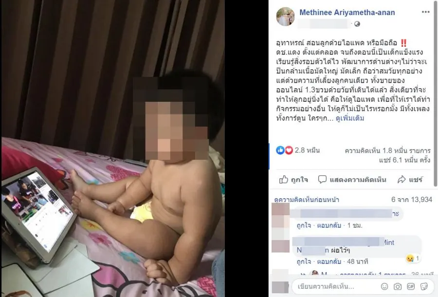 คุณแม่ขายของออนไลน์เล่าอุทาหรณ์การเลี้ยงลูก1.3ขวบวัยที่เดินได้แล้ว ด้วยไอแพด-มือถือ ทำหนูน้อยเริ่มเรียกร้องความสนใจโยนข้าวของ กระจายเต็มบ้านถ้าดูไอแพด มีโฆษณาขั้น จะร้องโวยวายตอนนี้ 2 ขวบแล้ว สนทนาตอบโต้ไม่ได้เลย สุดท้ายต้องพาลูกไปพบจิตแพทย์เด็ก