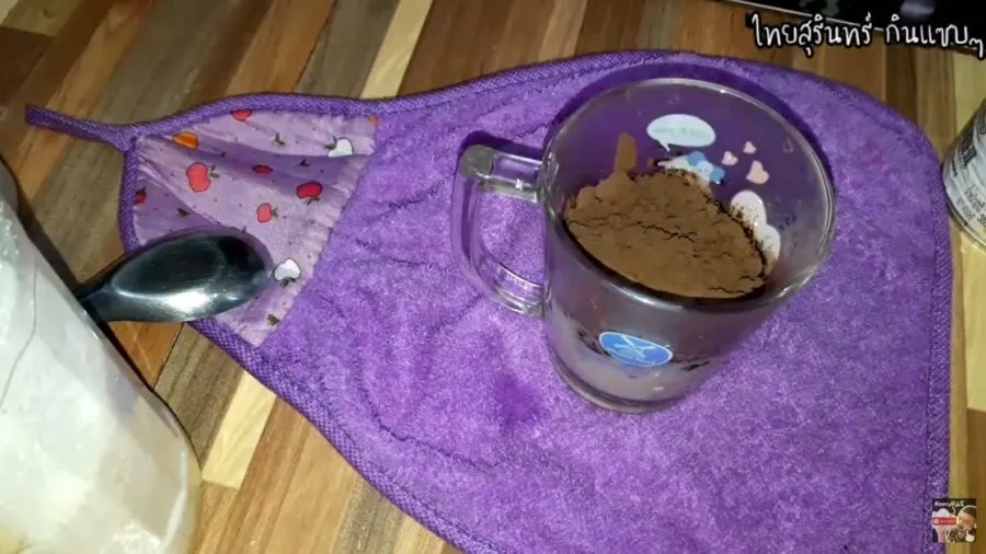 2. ตักนมต้มใส่แก้วชง ใส่ผงโกโก้ลงไป คนให้ผงโกโก้ละลายดี