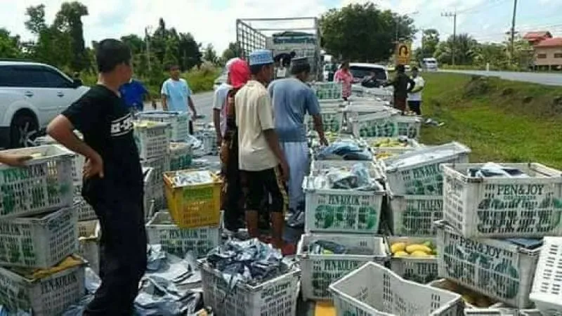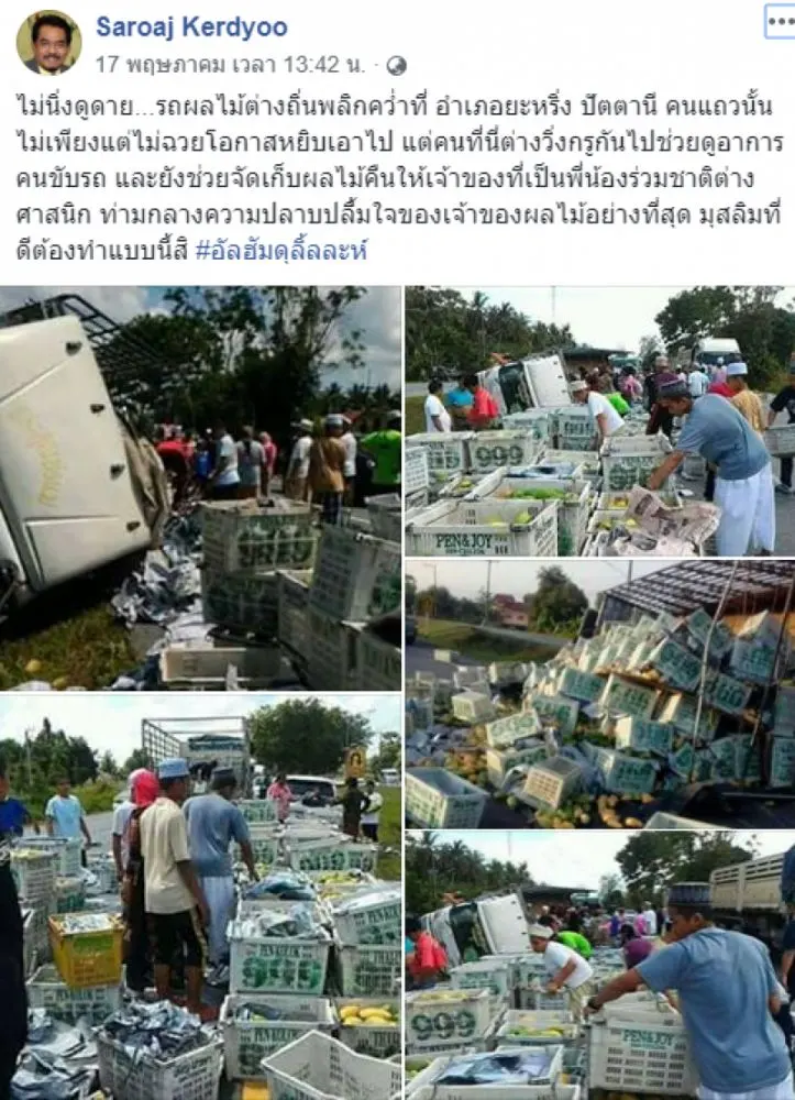 เป็นอีกหนึ่งเรื่องราวที่โซเชียลเข้ามาแสดงความเห็นกันเป็นจำนวนมาก หลังมีผู้ใช้เฟสบุ๊ครายหนึ่งได้ออกมาโพสต์ภาพ พร้อมทั้งได้ระบุข้อความว่า ไม่นิ่งดูดายรถผลไม้ต่างถิ่นพลิกที่ อำเภอยะหริ่ง ปัตตานี คนแถวนั้นไม่เพียงแต่ไม่ฉวยโอกาสหยิบเอาไป แต่คนที่นี่ต่างวิ่งกรูกันไปช่วยดูอาการคนขับรถ และยังช่วยจัดเก็บผลไม้คืนให้เจ้าของที่ เป็นพี่น้องร่วมชาติต่างศาสนิก ท่ามกลางความปลาบปลื้มใจของเจ้าของผลไม้อย่างที่สุด มุสลิมที่ดีต้องทำแบบนี้สิ
