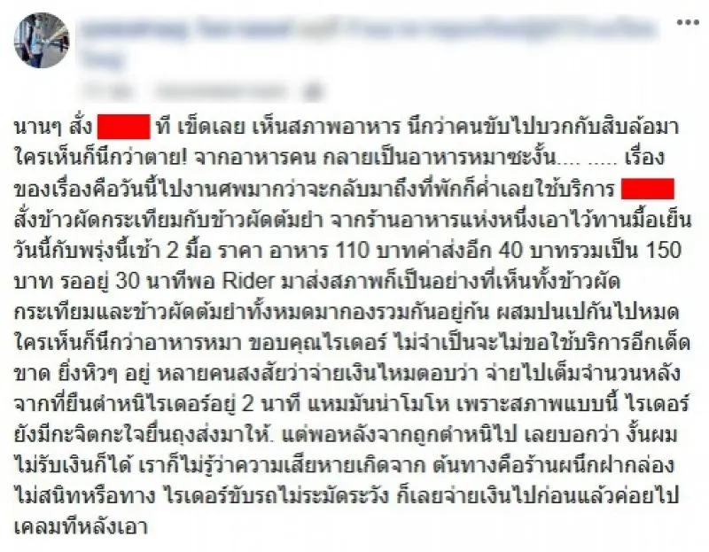 รออยู่ 30 นาที พอไรเดอร์มาส่งสภาพก็เป็นอย่างที่เห็นทั้งข้าวผัดกระเทียมและข้าวผัดต้มยำทั้งหมดมากองรวมกันอยู่ก้น ผสมปนเปกันไปหมด ใครเห็นก็นึกว่าอาหารหมา ขอบคุณไรเดอร์ ไม่จำเป็นจะไม่ขอใช้บริการอีกเด็ดขาด ยิ่งหิวๆ อยู่ หลายคนสงสัยว่าจ่ายเงินไหมตอบว่า จ่ายไปเต็มจำนวนหลังจากที่ยืนตำหนิไรเดอร์อยู่ 2 นาที