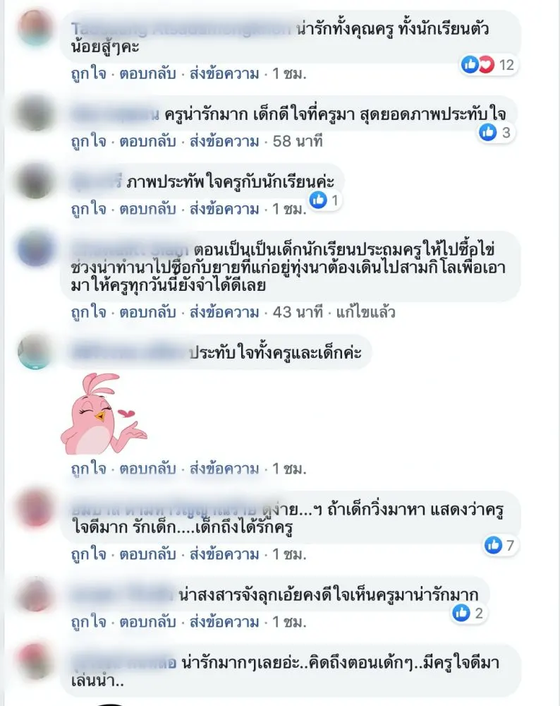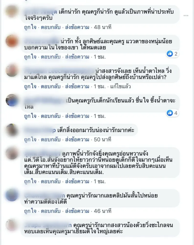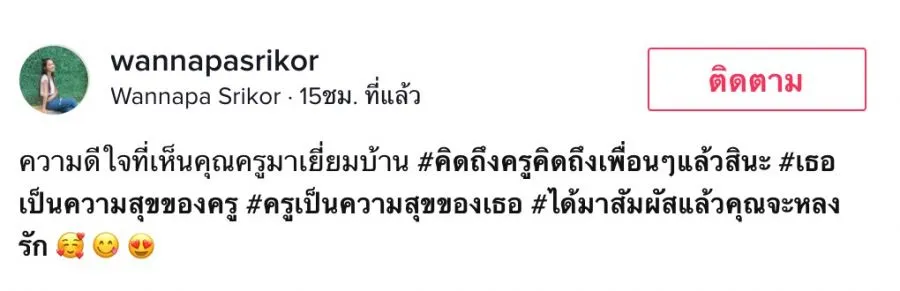 พร้อมระบุข้อความว่า “ความดีใจที่เห็นคุณครูมาเยี่ยมบ้าน #คิดถึงครูคิดถึงเพื่อนๆแล้วสินะ #เธอเป็นความสุขของครู #ครูเป็นความสุขของเธอ #ได้มาสัมผัสแล้วคุณจะหลงรัก