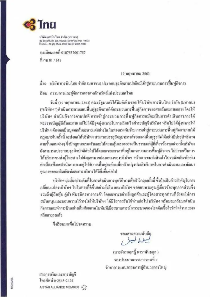 อีกทั้งบริษัทฯ ยังสามารถประกอบธุรกิจปกติต่อไปได้ตลอดระยะเวลาที่อยู่ในกระบวนการฟื้นฟูกิจการ ไม่ว่าจะเป็นการให้บริการขนส่งผู้โดยสารไปยังจุดหมายปลายทางของการบินไทยทั่วโลก หรือการขนส่งสินค้าไปรษณียภัณฑ์อย่างต่อเนื่อง ซึ่งจะดําเนินการควบคู่ไปกับการฟื้นฟูองค์กร เพื่อปรับปรุงประสิทธิภาพในการดําเนินงานและพัฒนาคุณภาพของผลิตภัณฑ์และการบริการให้ดียิ่งขึ้น