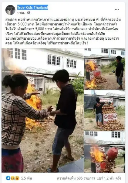 ได้มี เฟซบุ๊กแฟนเพจ True Kids Thailand ได้โพสข้อความพร้อมภาพและวิดีโอ โดยระบุข้อความว่า “สุดสลด พ่อค้าหนุ่มจุดไฟเผาร้านและเข่งปลาทู ประท้วงระบบ AI ที่คัดกรองเงินเยียวยา 5,000 บาท โดยมีแม่พยายามเข้าห้ามแต่ไม่เป็นผล โดยกล่าวว่าเค้าไม่ได้รับเงินเยียวยา 5,000 บาท ไม่พอใจวิธีการคัดกรอง ทำให้คนที่เดือดร้อนจริงๆ ไม่ได้รับเงินแต่คนที่กรอกข้อมูลเป็นแต่ไม่เดือดร้อนกลับได้เงิน วอนคนในรัฐบาลช่วยเหลือพวกเค้าด้วยความจริงใจ และลงมาช่วยดู ช่วยตรวจสอบ ให้คนที่เดือดร้อนจริงๆ ได้รับการช่วยเหลือโดยเร็ว !”