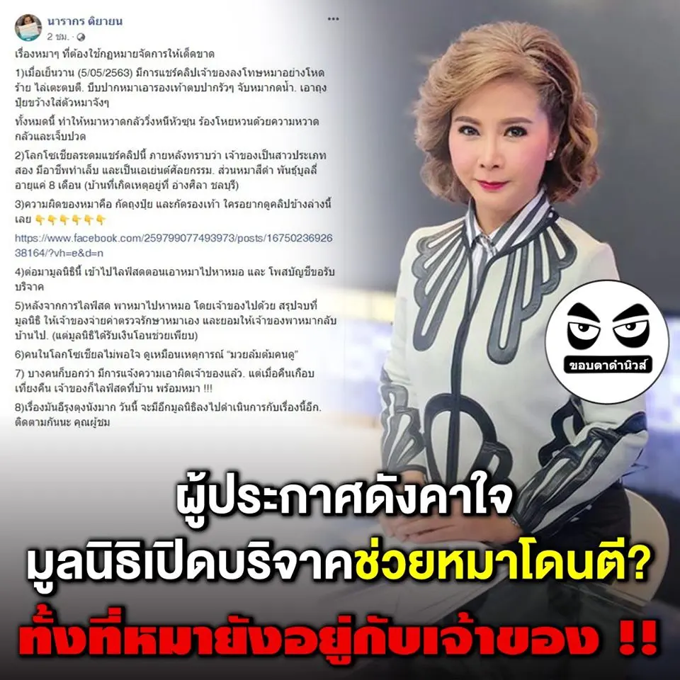 เพจ Red Skull Variety แชร์เรื่องราวยกตัวอย่างกรณี ผู้ประกาศข่าวดังคาใจ!! มูลนิธิเปิดรับบริจาคช่วยเหลือหมาโดนตี ทั้งที่หมายังอยู่กับเจ้าของ มีข้อความว่า "มีหลายคนมาบอกกูนะ ขอความช่วยเหลือไป เคสไม่ดัง ไม่รับนะครับ ไล่ไปแจ้งความ ไล่ไประดมทุนมา