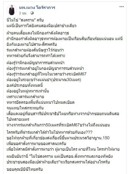 นี่ไม่ใช่ “สงคราม” ครับ แต่นี่เป็นการไล่ยิงคนสองมือเปล่าข้างเดียว ฝ่ายคนเสื้อแดงไม่มีกองกำลังติดอาวุธ ถ้ามีกองกำลังติดอาวุธทหารต้องตายเป็นเรือนสิบเรือนร้อยแน่นอน แต่นี่ยิงกันเองตายไปสาม-สี่ศพครับ ร่มเกล้าตายต้องสันนิษฐาไว้ก่อนว่าทหารด้วยกันจึงสามารถทำได้เพราะต้องรู้ว่ามีกองบัญชาการรบส่วนหน้า