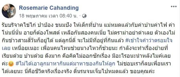ชาวเน็ตมีการแชร์ข้อความจากเฟซบุ๊ก “Rosemarie Cahanding” ของ โรสแมรี่ คาฮันดิง หรือ โรส อดีตนักร้องชื่อดังยุค 90 ซึ่งเมื่อปี 2559 เจ้าตัวเคยเปิดเผยว่าคุณพ่อป่วยหนักเสียชีวิต มีหนี้จากค่ารักษาพยาบาลนับแสนบาท และเจ้าตัวต้องดูแลลูกชายเพียงลำพังหลังจากสามีทิ้งไปด้วย