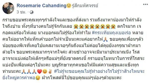 ต่อมา โพสต์อีกว่า กราบขอบพระคุณทุก ๆ กำลังใจและของที่ส่งมา รวมถึงมาหาน้องมาให้กำลังใจถึงบ้าน ทั้ง ๆ ที่บางคนไม่รู้จักกันเลย ตกใจมาก เจกอดแม่ร้องไห้เลย นางบอกผมไม่รู้ร้องไห้ทำไม #กระเทียมถุงเบอเร่อ หลายคนไม่อยากให้แท็กเค้าบอกไม่จำเป็นนะคะแค่อยากให้ ขอบคุณเพื่อน ๆ ตัวน้อยของพีเจที่เคยไปแคสงานเจอ ๆ กันถึงแม่ไม่ค่อยได้คุยยังกรุณาฝากมาด้วยใจ