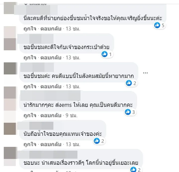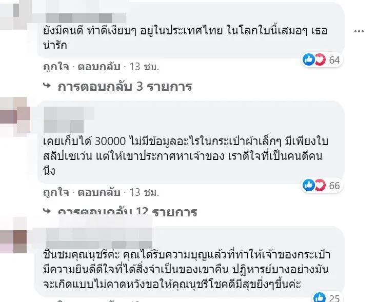 เมื่อเรื่องราวนี้ถูกเผยแพร่ออกไป ก็มีชาวเน็ตเข้ามาชื่นชมพลเมืองดีที่เก็บกระเป๋าเงินส่งคืนเจ้าของเป็นจำนวนมาก