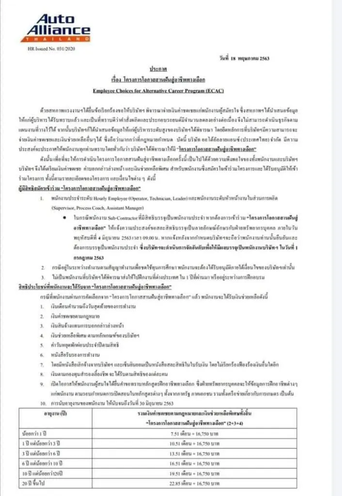 บริษัท ออโต้อัลลายแอนซ์ (ประเทศไทย) หรือ AAT นิคมอุตสาหกรรม อีสเทิร์นซีบอร์ด อำเภอปลวกแดง จังหวัดระยอง โรงงานประกอบรถยนต์ฟอร์ดและมาสด้า ได้ออกมาประกาศเปิด โครงการโอกาสสานฝันสู่อาชีพทางเลือก หรือ “โครงการสมัครใจลาออก”