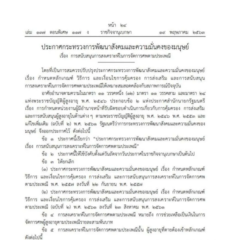 เว็บไซต์ราชกิจจานุเบกษา เมื่อวันที่ 19 พ.ค.2563 เผยแพร่ ประกาศกระทรวงการพัฒนาสังคมและความมั่นคงของมนุษย์ เรื่อง การสนับสนุนการสงเคราะห์ในการจัดการศพตามประเพณีฉบับใหม่ โดยจะให้เงินสนับสนุนสงเคราะห์จัดการศพตามประเพณี ผู้สูงอายุ 60 ปีขึ้นไป รายละ 3,000 บาท ให้ผู้ที่รับผิดชอบในการจัดการศพตามประเพณีรายนั้นยื่นคำขอในท้องที่ที่ผู้สูงอายุมีชื่ออยู่ในทะเบียนบ้านหรือภูมิลำเนา ในขณะถึงแก่ความตาย พร้อมหลักฐานต่างๆ ภายใน 6 เดือน โดยมีรายละเอียดมีดังนี้