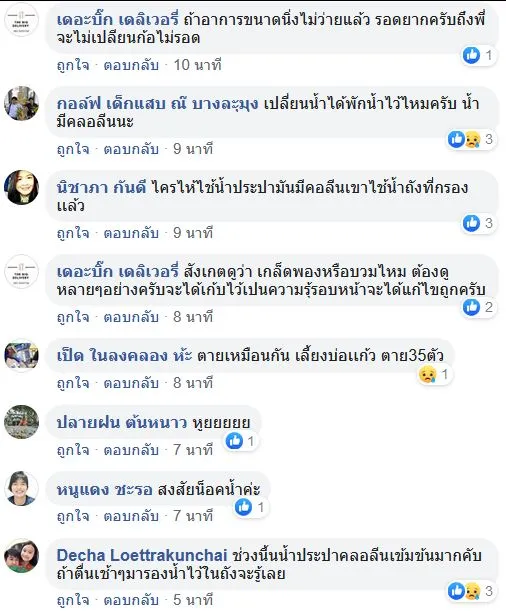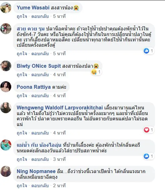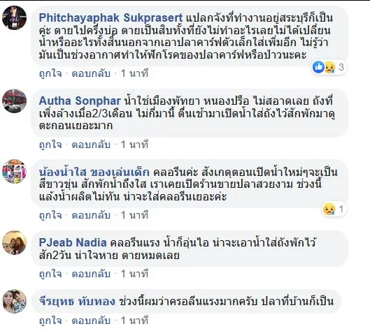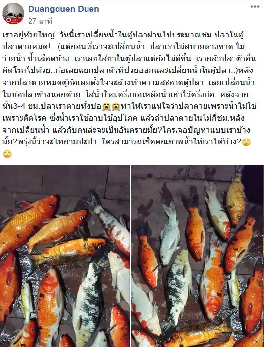 ทำให้เราแน่ใจว่าปลาตายเพราะน้ำไม่ใช่เพราะติดโรค ซึ่งน้ำเราใช้อาบใช้อุปโภค แล้วถ้าปลาตายในไม่กี่ชม.หลังจากเปลี่ยนน้ำ แล้วกับคนล่ะจะเป็นอันตรายมั้ย?ใครเจอปัญหาแบบเราบ้างมั้ย?พรุ่งนี้ว่าจะโทถามปะปา..ใครสามารถเช็คคุณภาพน้ำให้เราได้บ้าง?🙄🙄