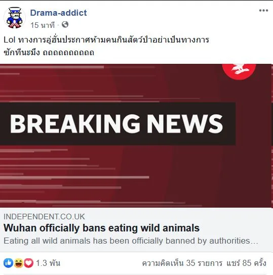 ด่วน! ทางการอู่ฮั่นประกาศ "ห้ามคนกินสัตว์ป่า" อย่างเป็นทางการ