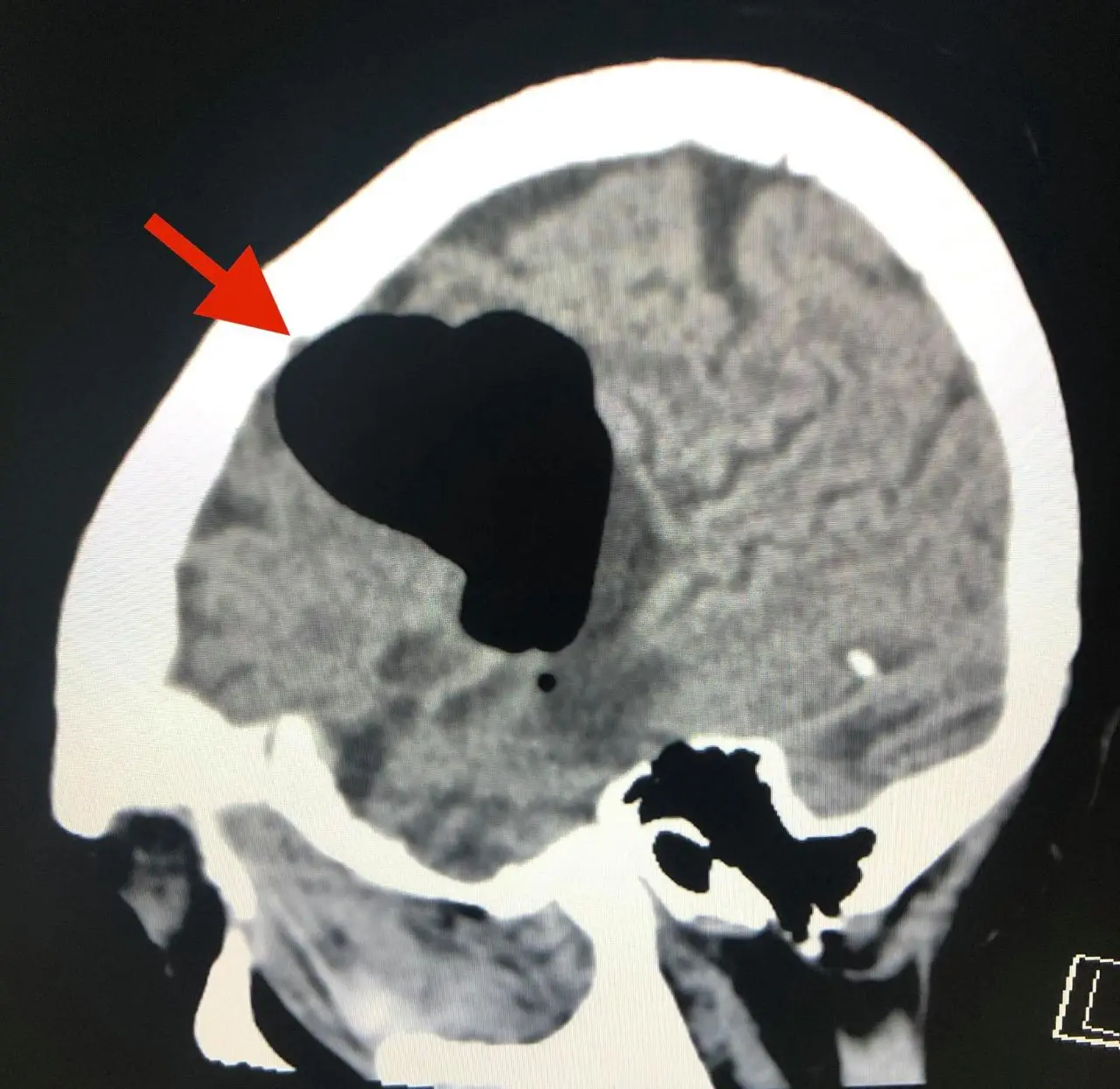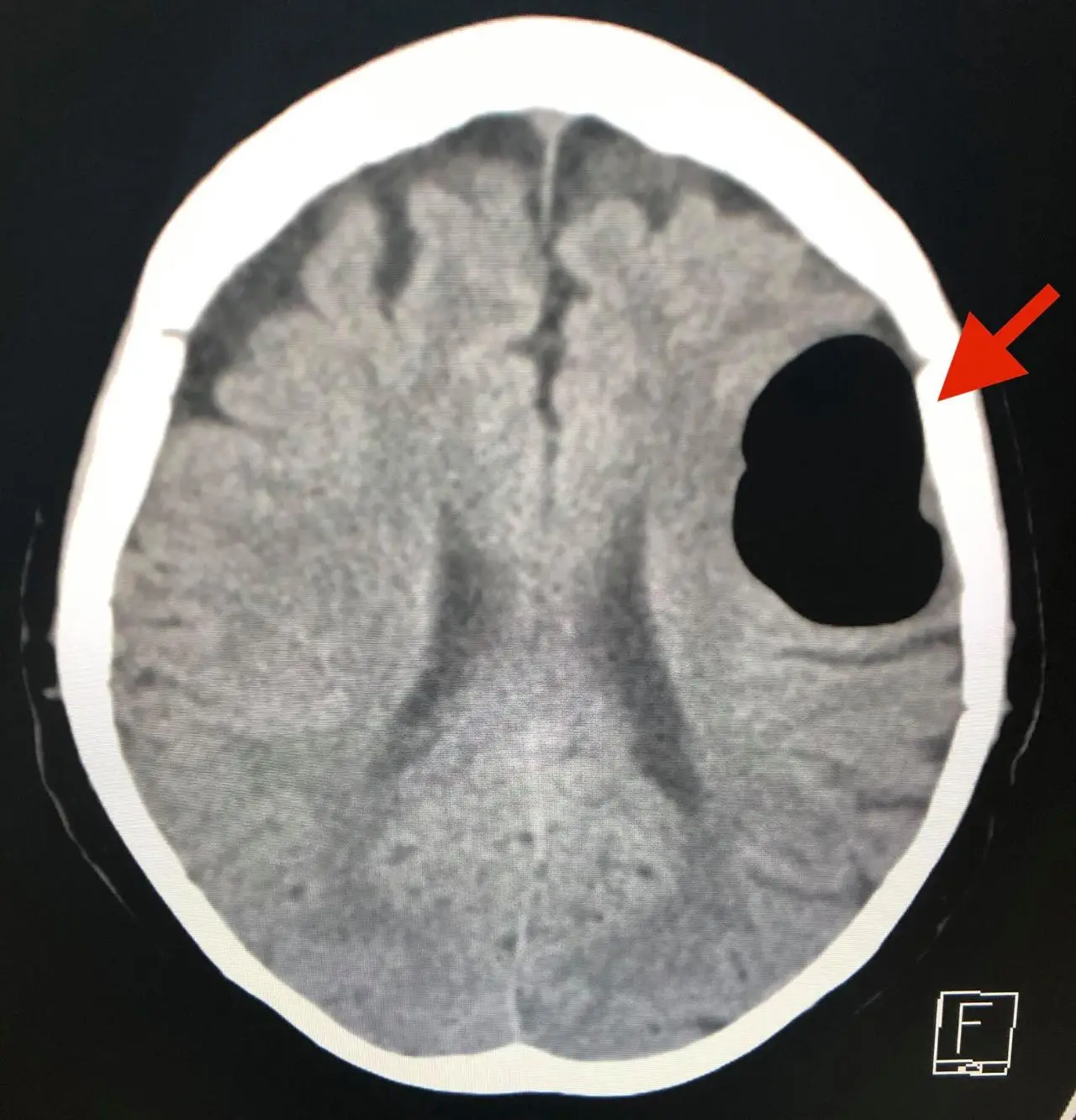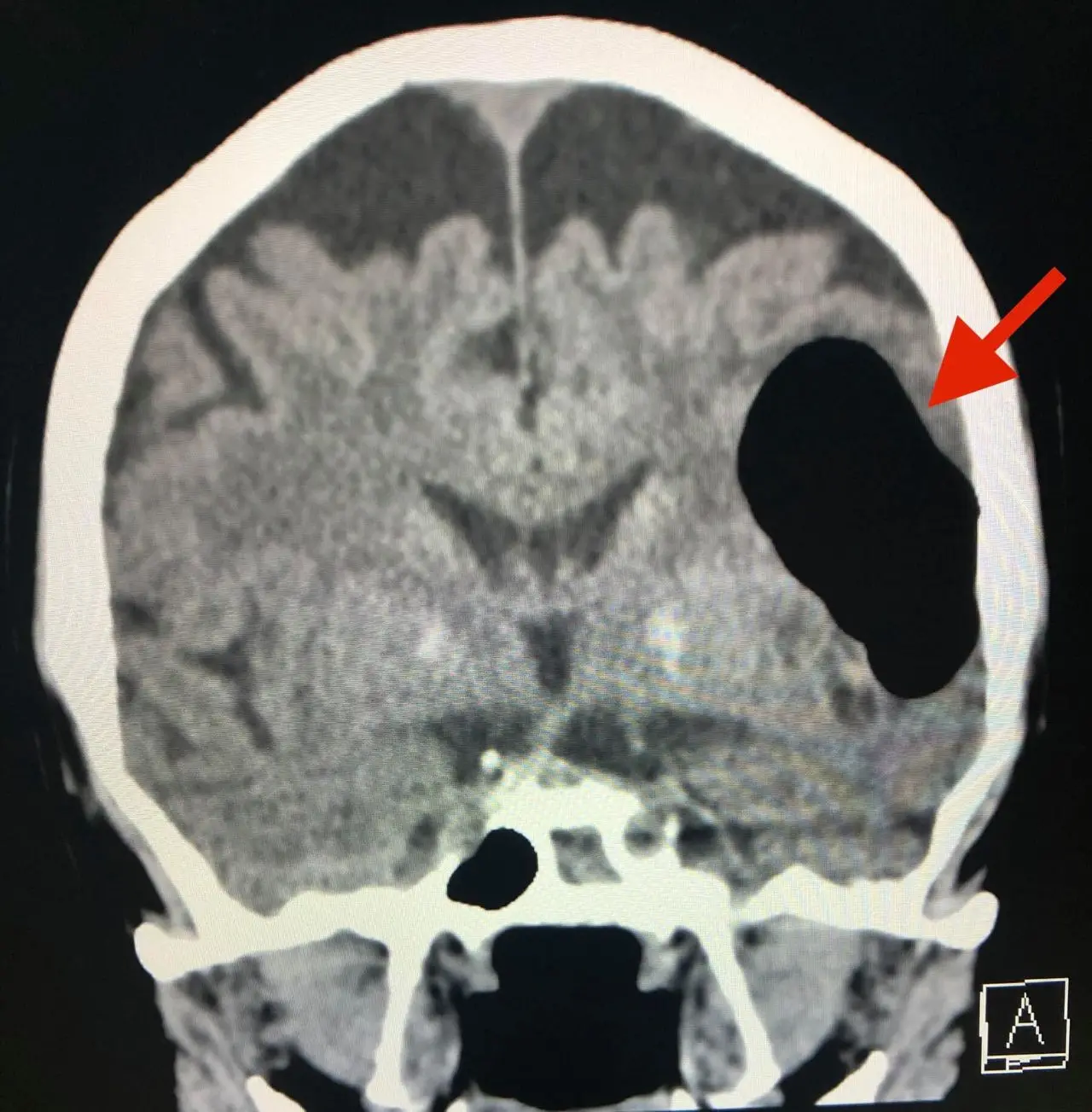 วันที่ 14 พฤษภาคม 2563 ผู้ป่วยกลับมารพ.อีกครั้งหลังจากจามแล้วเอามือปิดปากปิดจมูกเพราะไม่อยากให้มีเสียงดัง หลังทำมีอาการพูดไม่ชัด หน้าข้างขวาเบี้ยว หูข้างซ้ายอื้อ มีเสียงดัง ทำคอมพิวเตอร์สมองพบลม (air pocket) ในเนื้อสมองข้างซ้ายขนาด 5.1 × 4.1 × 2.8 เซนติเมตร (ดูรูป) ตำแหน่งเดิมเหมือนเมื่อ 3 ปี 5 เดือนก่อน แต่ปริมาตรของลมในเนื้อสมองครั้งนี้น้อยกว่า ผู้ป่วยนอนในโรงพยาบาล 4 วัน อาการดีขึ้นช้าๆ กลับบ้านได้